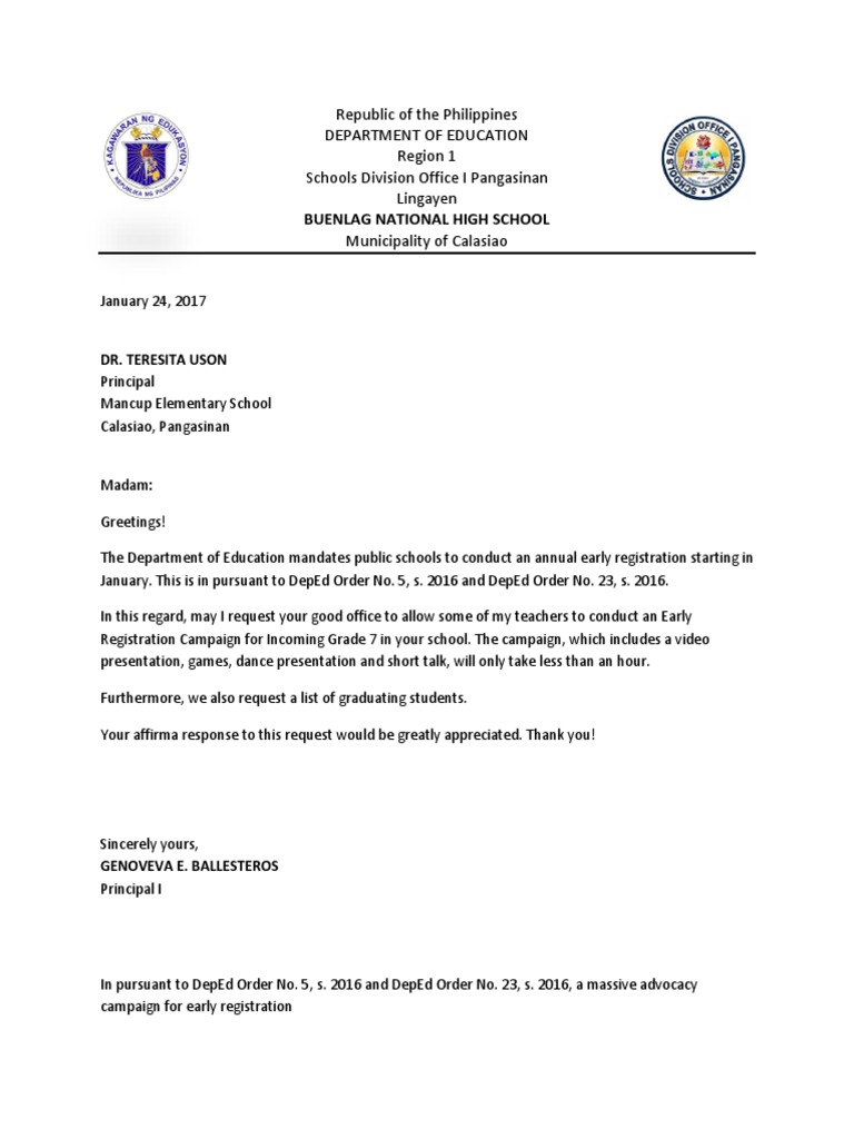 Letter To Principals Early Registration PDF